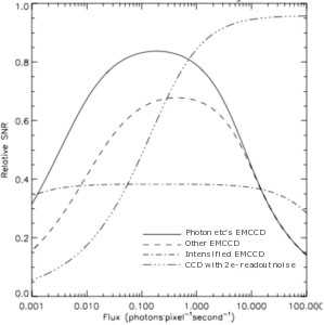 The number of electrons collected is normally proportional to the amount of light received; however, when the observation conditions offer only a few incident photons, a lengthy wait time is required before the wells are enough charged to create an interesting image. For some phenomenon, this time-consuming process is too onerous to capture the process under investigation. Furthermore, there is noise associated with the reading of the electrons at the output of the array of wells. This noise is generally very weak, around 2 to 10 electrons / 1000. On the other hand, in low light situations, for example when only one electron per well is created, this noise is paramount. In order to increase CCD’s sensitivity, an EMCCD (Electron-Multiplying CCD) offers an amplification system at the output of the CCD through high voltages. This system allows for considerable amplification, with one electron transforming into 1000 or even 2000 available for reading. Thus, the readout noise discussed above becomes negligible with EMCCDs. These detectors permit observation of phenomenon under very dark conditions since every photon is multiplied a thousand times. At this level, a new source of noise becomes a factor, which limits the performance of these cameras; this is a challenge uniquely suited to Photon etc’s innovative tools.