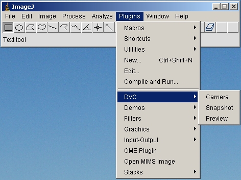 To install the ImageJ plugin, go to the [HomeDrive]\DVCCo\ImageJ\plugins folder and copy the DVC subfolder to the [ProgramFiles]\ImageJ\plugins folder and launch ImageJ.
